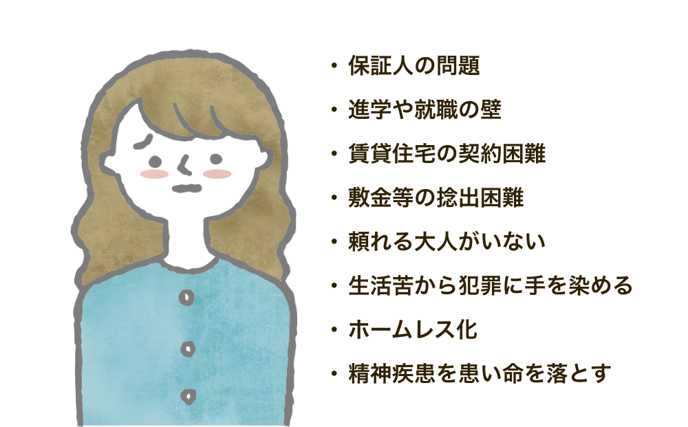 そんな彼らを待ち受けているのは社会の壁です。保証人の問題、進学、就職、賃貸住宅の契約、敷金等の捻出など、解決されていない問題が山ほどあります。